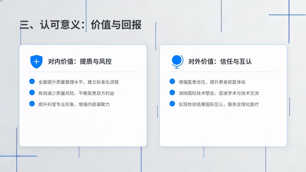 • 医疗能力认证辅导的意义在于提高医疗机构或医疗专业人员的服务质量和安全性,帮助他们适应医疗行业的不断发展和医疗模式的转变,促进医疗人员的职业发展和素质提升,实现医疗行业的标准化管理,提高患者对医疗服务的满意度和信任度,优化资源配置,推动医疗行业的整体进步和发展,提高医疗服务水平和社会认可度